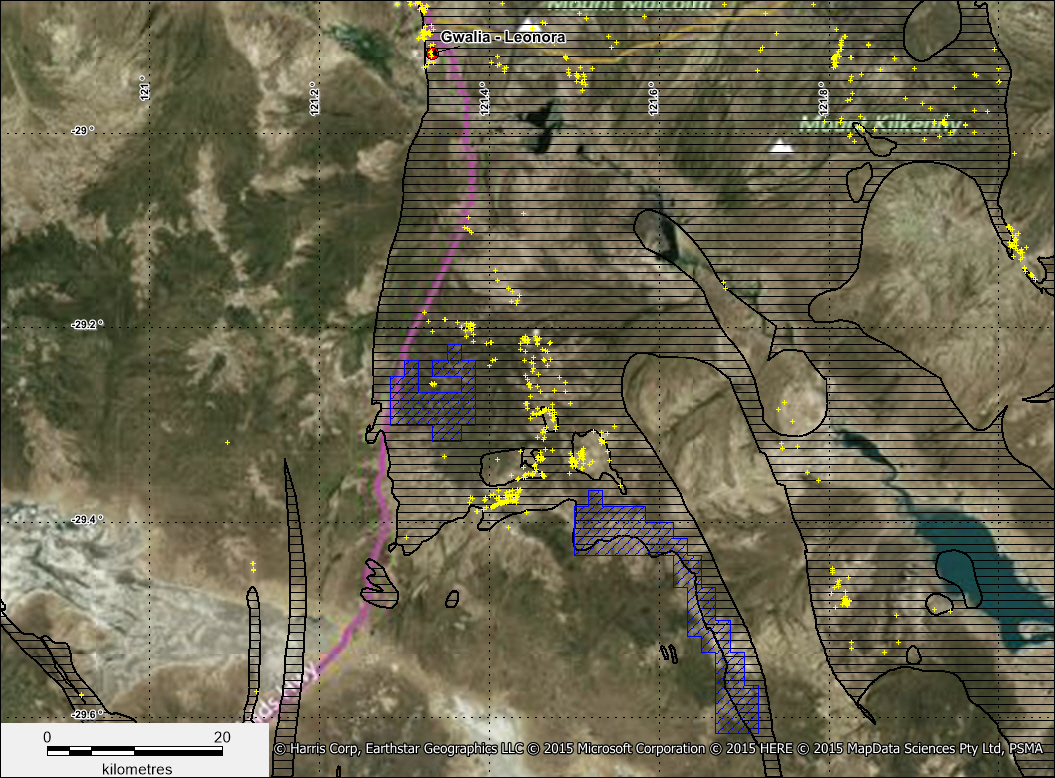 FIGURE 1 Kookynie Gold Project – Satellite image showing location of the tenements (blue hatched) south of Leonora along with the operating Gwalia gold mine at Leonora and the known gold occurrences in yellow. The greenstone terrain is shown in black.