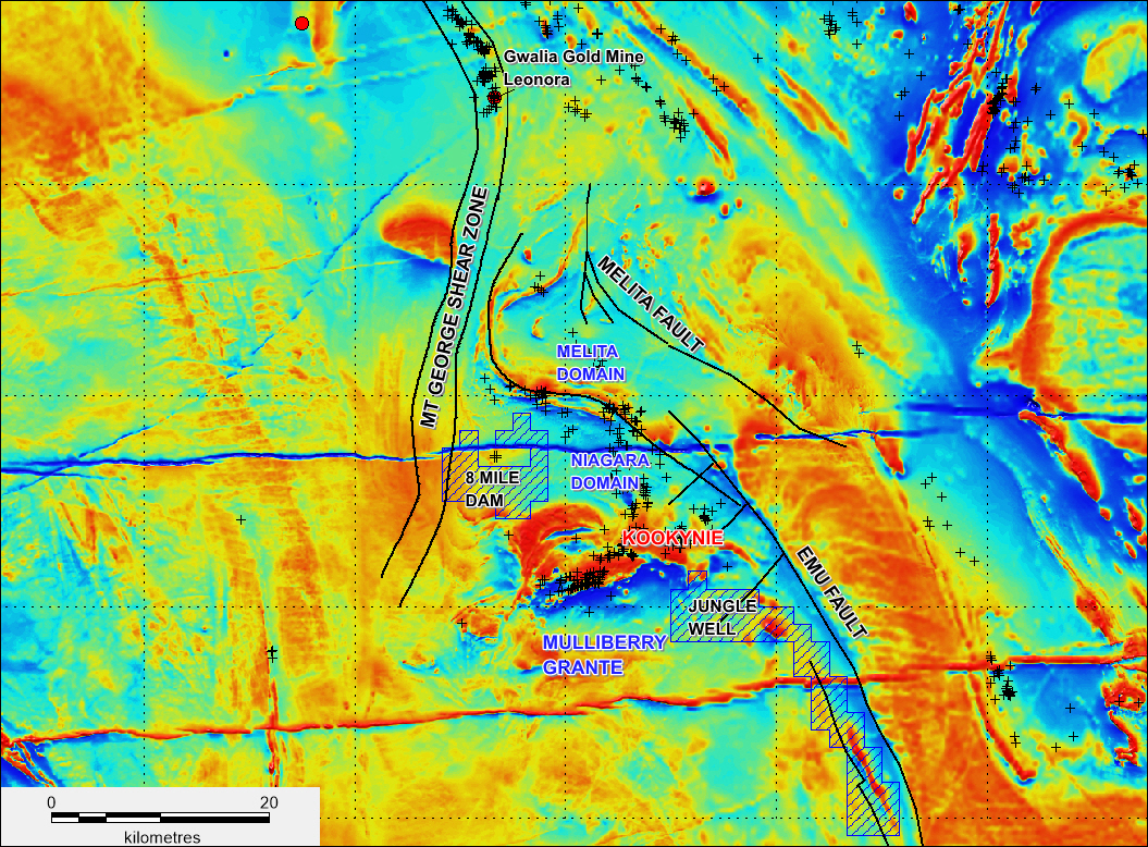 FIGURE 2 Kookynie Gold Project – Aeromagnetic image showing the two tenements, major structures and “domains”. Gold occurrences are shown as black crosses.