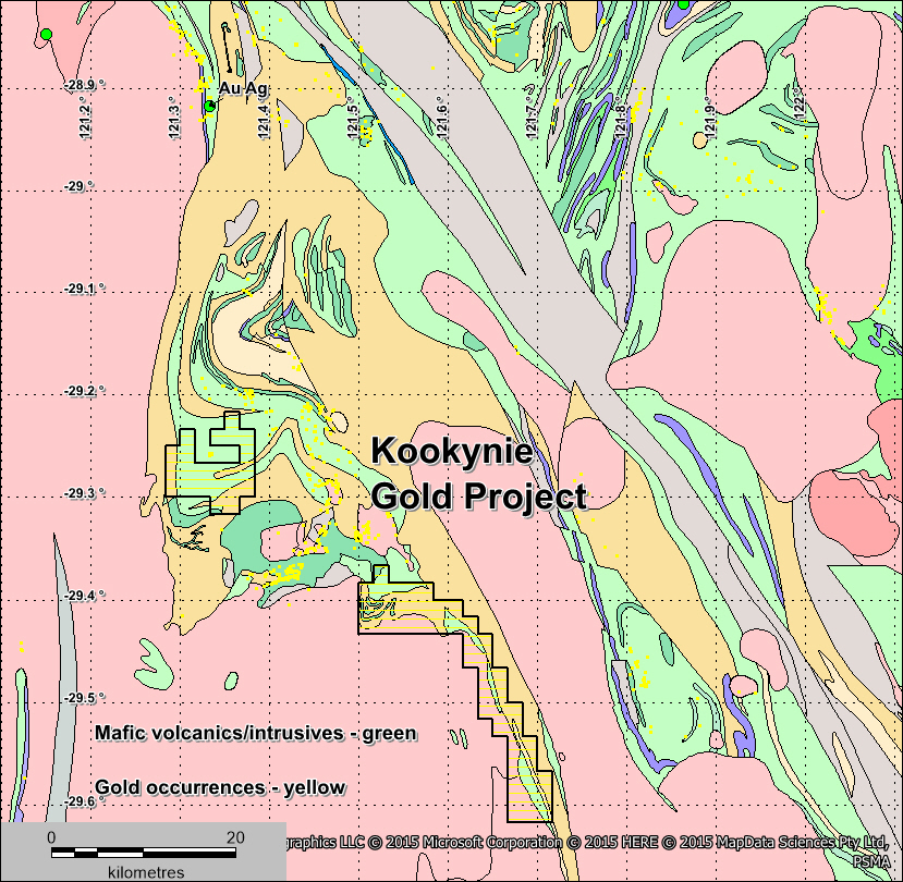 The Kookynie Gold Project and lies within the central Norseman-Wiluna belt of the Eastern Goldfields Super Province of the Archaean Yilgarn Craton, Western Australia. The Tenements are located north west and south east of the former gold mining town of Kookynie. The 8 Mile tenement straddles the regionally important Mount George Shear (Figure 2), which separates the Raeside geological domain from the Niagara and Melita geological domains. The Jungle Well tenement straddles to the Emu Fault. The project area covers predominantly Melita metasediments (part of the Melita greenstone suite comprised of a bimodal rhyolite-basalt association and several dolerite sills and dykes), and biotite monzogranite (FIGURES 3 AND 4). The interpreted depositional setting for the greenstone association on Melita is the margin of a large rift basin represented by the Kalgoorlie Terrane, and greenstones are assigned to the Gindalbie Terrane.